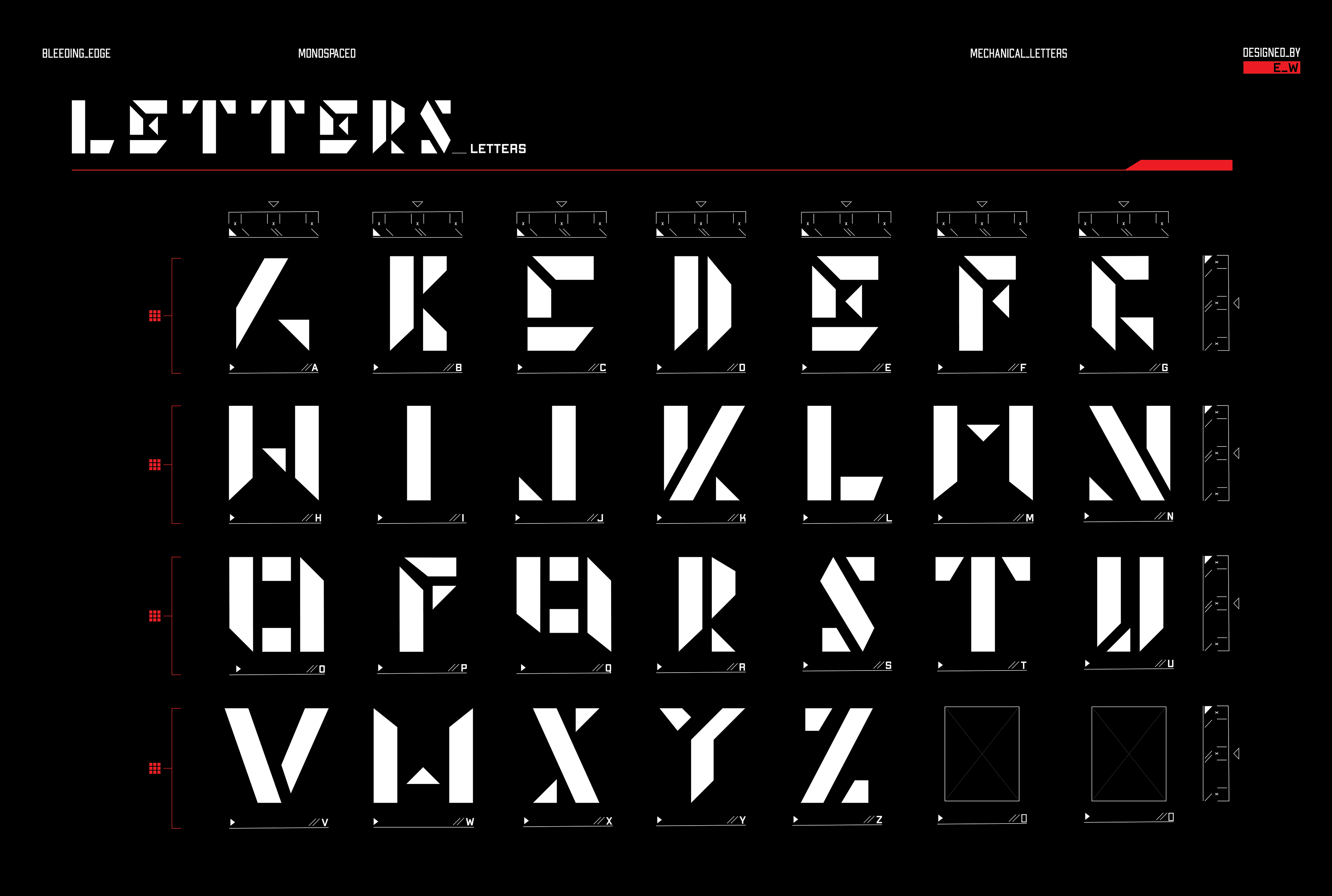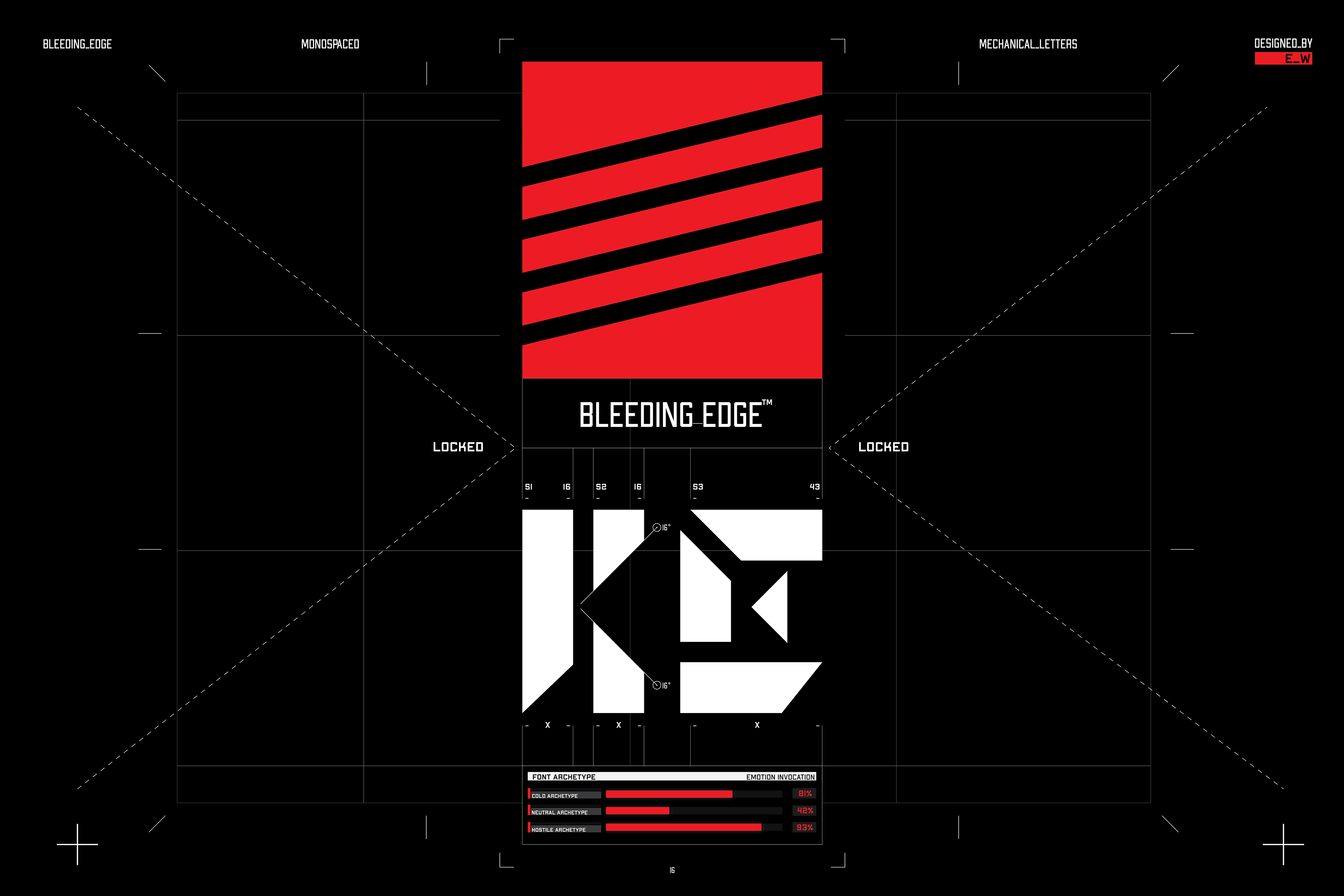 Inspired by the geometric shapes seen in modern day machines and sharp edges of utility knives. Bold text and large titles are best suited for this display font. This font is state-of-the art, Avant-Garde, Bleeding_Edge_.